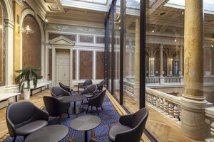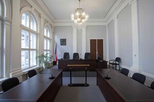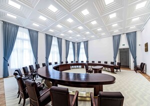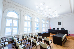 Another important and prestigious room of the Constitutional Court is the hall known as the "Grand Council". Its full-scale renovation has been launched in the spring of 2022. It was based on a design created by the architectural office Architekti Hrůša a spol., Ateliér Brno, s. r. o. In this design, Professor Hrůša conceives the reconstructed space, i.e. the hall and its adjacent rooms, as a single unit whose individual parts naturally relate to each other. The hall was shaped after famous halls of the past, i.e. with an artistically rich ceiling with coffers. The new solution was inspired by the original square ceiling, where a strong role is played by the aesthetics of geometric shapes. The original ceiling had to be replaced because it was unstable and fragile. The lighting situation was not ideal either. The existing natural lighting provided by five windows was uneven and, even in combination with artificial lighting from the chandelier and fluorescent lamps, there was simply not enough light. The disparate lighting elements were thus replaced by a uniformly illuminated ceiling. The basic conceptual design of the room places its visitors on an imaginary path of the search for constitutionality. The seating arrangement for table meetings forms an incomplete circle, with its missing section filled in by a newly created recess containing the text of the Constitution. This cornerstone of Czech Law will thus become a symbolic, permanent and important participant in future meetings. The Constitution is guarded on its sides by State emblems cast in leaded glass and the carpet on the floor symbolises the uncertain surface of social waves – the fluidity of past and present. The reconstruction also affected the remaining prestigious and ceremonial spaces in the building, which lead from the meeting and private rooms of the President of the Constitutional Court through the reconstructed Grand Council to the facilities for constitutional officials. The hall itself has two entrances – a grand one for visitors and an internal one for staff. The construction work started in the spring of 2022 and consisted mainly of removing the non-original floor layers and the ceiling. A new partition at the head of the room was used to hide the cooling system, new timber flooring was laid in all areas, the wooden door panels were either refurbished or replaced, and the walls were resurfaced following a new electrical wiring installation. Finally, glass luminaires and State symbols from Czech manufacturers were installed. The interior was furnished with restored table furniture from the 1920s and complemented by refurbished leather-covered armchairs. The windows are covered with elegant velvet drapes, and white muslin curtains are used to separate the space from the outside traffic and the opposite building. The Grand Council hall has also been fully equipped with an audiovisual system for international teleconferences, including interpretation capabilities, and it is ready to welcome even the most important visitors from February 2023.