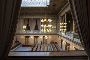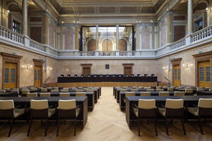 In 2017, the technically unsuitable state of the Assembly Hall of the Constitutional Court and the adjacent areas brought the Constitutional Court to the decision to renovate and restore it. A comprehensive architectural project followed, which did not only deal with this particular space. The Assembly Hall and the surrounding areas are, from an artistic and historical perspective, one of the most important parts of the interior of the building. From a social point of view, this is the space where representative activities of the Constitutional Court take place, for example, plenary sessions, international conferences, thematic lectures by renowned international experts in the field of law, and similar important events. The main idea of the project was to return this space to its original state and renew the original layout, which is most apparent in the Vestibule of the Assembly Hall, and, at the same time, ensure modern functioning pertaining to the current needs of the Constitutional Court.